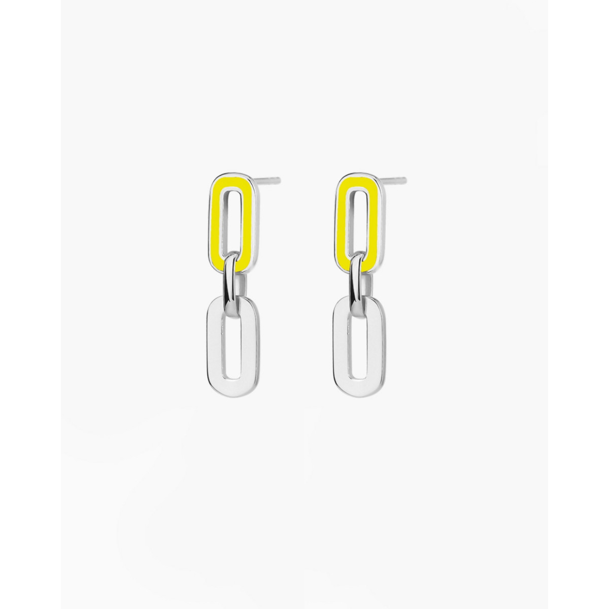 Earrings in 925 Sterling Silver with a link embellished with fluorescent yellow enamel connected to a longer smooth link . Earring height: 25mm. Clasp: push back. Finishes: Sterling Silver 925 and 18k Gold Plating of 1 Micron. Lightweight, versatile, and refreshing, the link earrings will be the center of attention on occasions that call for a standout look.